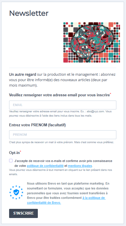 - lorsque le visiteur fait défiler une page (par exemple en lisant un article), ça déclenche l’apparition d’un « pop-up », un encart qui propose un formulaire pour s’inscrire à la newsletter . Ce formulaire est créé avec l’extension Bloom, de Divi, il est connecté à la liste Brevo mais n’est pas généré par Brevo.