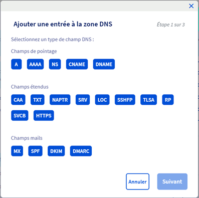 Dans l’onglet zones DNS du domaine concerné, cliquer sur « Ajouter une entrée » puis choisir champ mails > DMARC