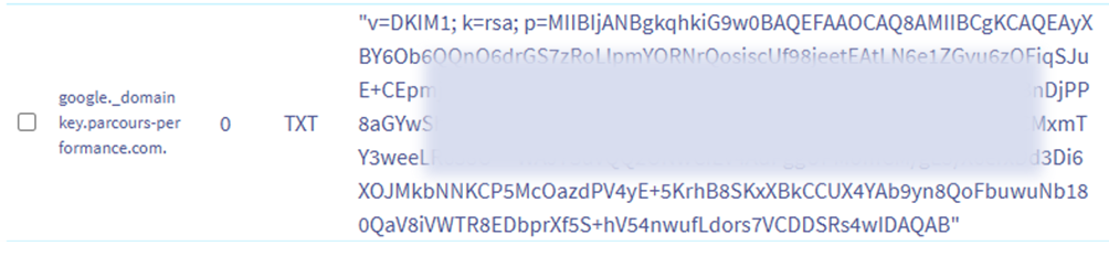 Le DKIM est une signature numérique qui prouve que l’email n’a pas été altéré. Ils ont été ajoutés automatiquement par OVH dans les zones DNS des noms de domaine. Il peut y avoir plusieurs clés DKIM (chacune dans un champ TXT). Elles sont créées automatiquement par OVH :